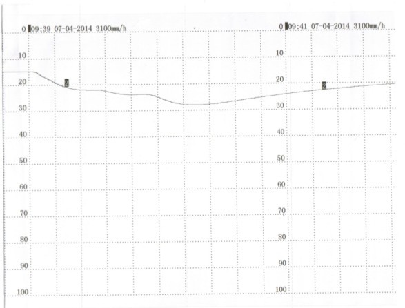 4.記錄功能:采用進口固定式熱敏頭,無筆墨消耗,無筆位誤差,抗震動;在100mm范圍內有800個熱印點對測量值進行趨勢記錄和數字記錄,在記錄曲線同時打印標尺刻度及每個通道標記,每隔100mm打印一次刻度值、當前時間和走紙速度。