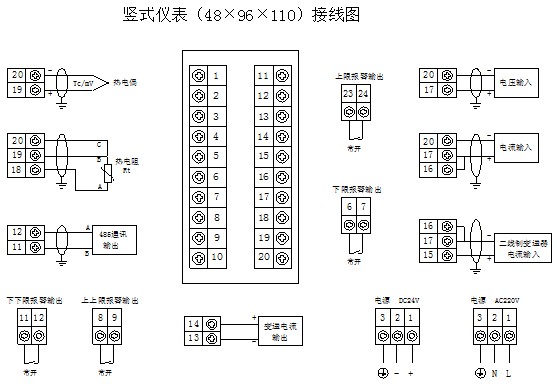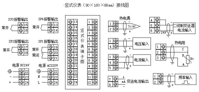 e)帶24V直流電源輸出的儀表,僅用于與二線制4-20mA輸出的無源變送器配套。該電源在儀表內部與輸入采樣電路連接,不可作為其它電源使用。