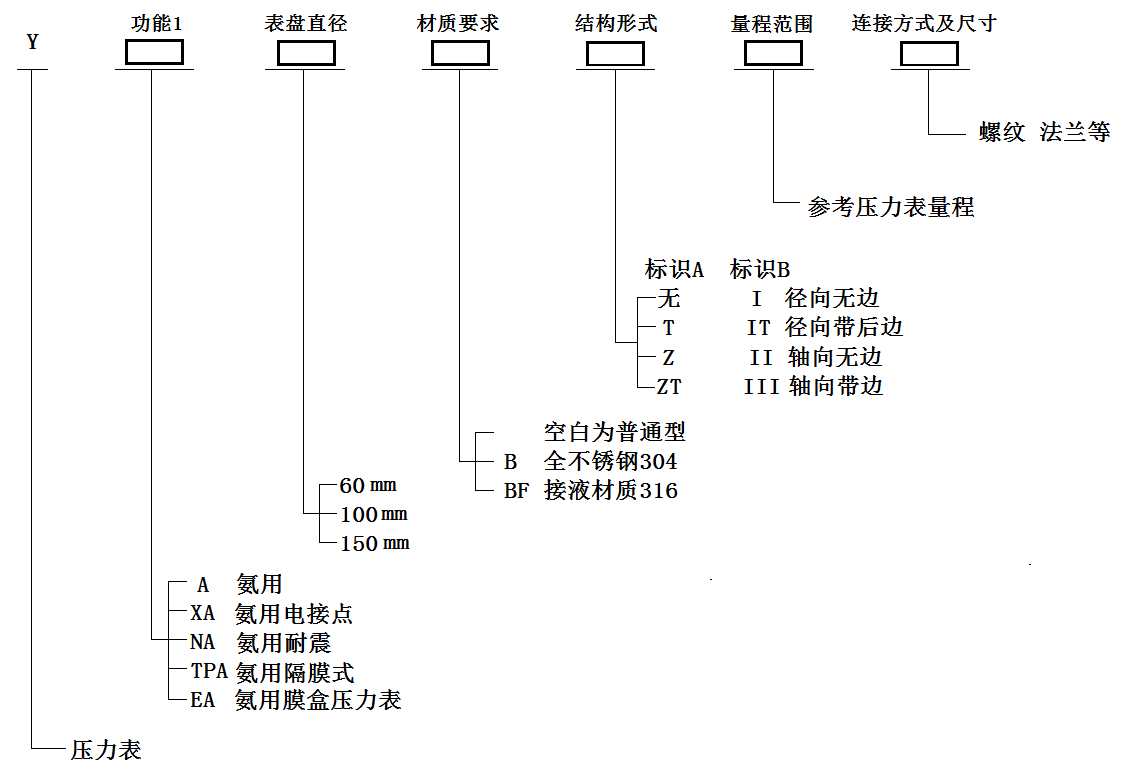 2、本公司還提供YNA系列耐震氨壓力表,YXCA氨用電接點(diǎn)壓力表.YE氨用膜盒壓力表,YTP氨用隔膜壓力表等產(chǎn)品。